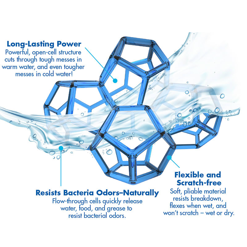 El DishFish no rayará ninguna superficie, ya sea que esté húmeda o seca. El DishFish está hecho con tecnología PowerCell y ForeverFresh Foam, un proceso revolucionario que en realidad engrosa la estructura de las células para hacerlas más fuertes. Su material suave y flexible resiste las roturas.